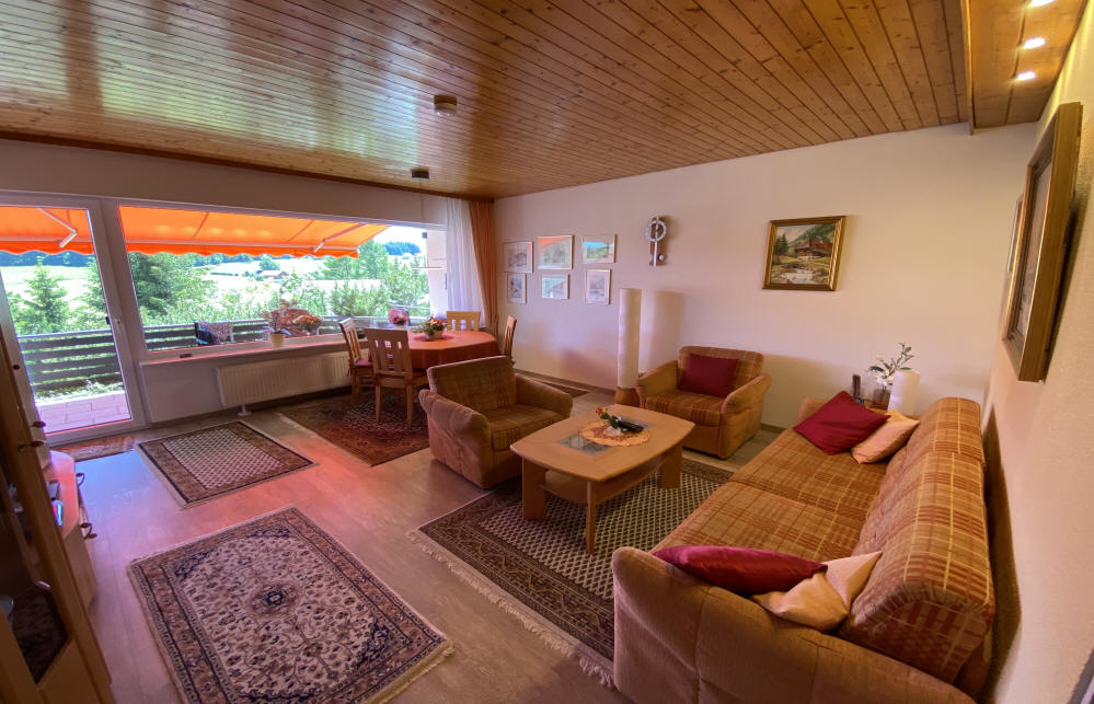 Gemütliche Polstergarnitur im Wohnzimmer. In der Essecke vor dem Panoramafenster steht ein ausziehbarer Tisch mit bis zu 6 Stühlen. Auch ein Kinderstuhl ist vorhanden.