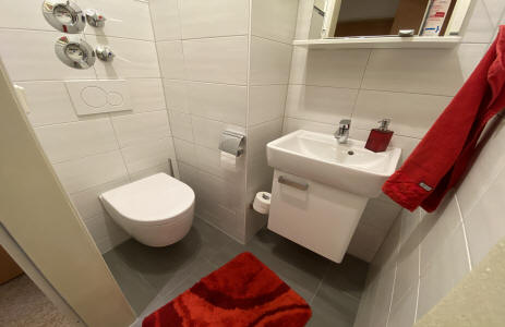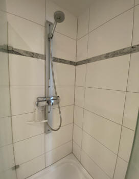 Das Bad ist mit einer großen Massagedusche, einem Spiegel- und Hochschrank und diversen Ablagemöglichkeiten ausgestattet.